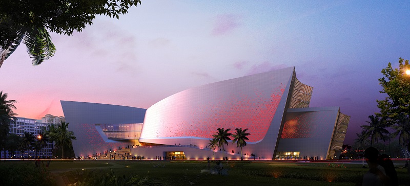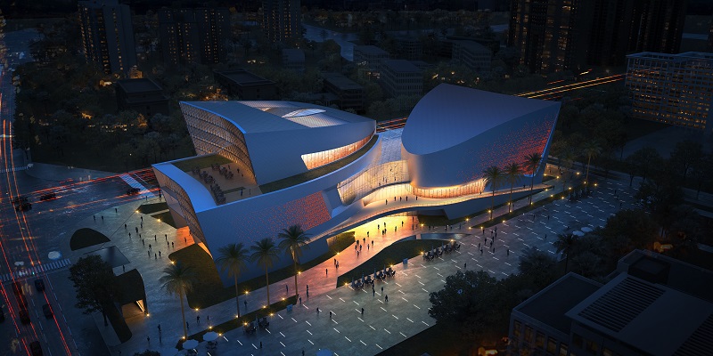 建筑方案以“海上帆、風(fēng)中翼、云上錦”為總體設(shè)計理念,采用“一體兩翼”的規(guī)劃格局,力求以鮮明獨特的建筑形象,充分展現(xiàn)在建設(shè)自貿(mào)港這一新時代背景下海南地域文化的“展示與弘揚(yáng)、傳播與交流、騰飛與發(fā)展”。整體建筑造型如海上揚(yáng)帆的造型高低錯落呼應(yīng),建筑形體面向東側(cè)城市廣場開敞,又如張開的親和雙臂,將漫步人群攬入其中,把從西北西南街角引入的城市人群,會聚于建筑中心設(shè)有共享、咖啡、新聞發(fā)布等休閑互動區(qū)的“城市文化客廳”,并將建筑空間自然劃分為南北兩翼,即位于北側(cè)的瓊劇會館劇場與南側(cè)的非遺藝術(shù)博物館區(qū),宛如展翅欲飛的“風(fēng)中雙翼”,迎海上來風(fēng)。